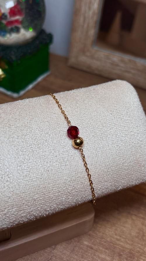 Ce bracelet délicat se distingue par l'harmonie d'une perle dorée et d'un cristal rouge sang. Il a été spécialement créé pour mettre en avant votre poignet en cette période de fêtes.